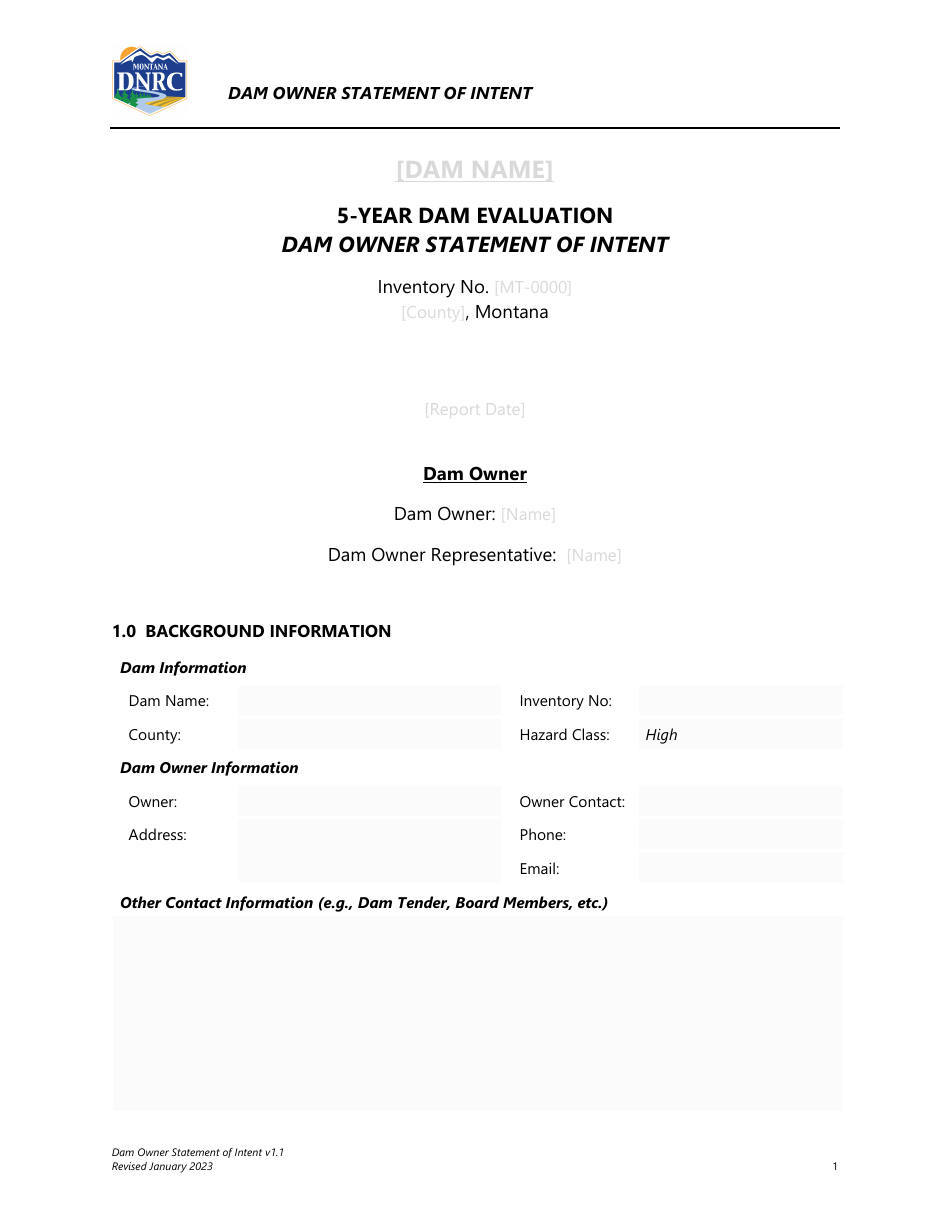 Montana 5 year Dam Evaluation Dam Owner Statement of Intent Fill Out