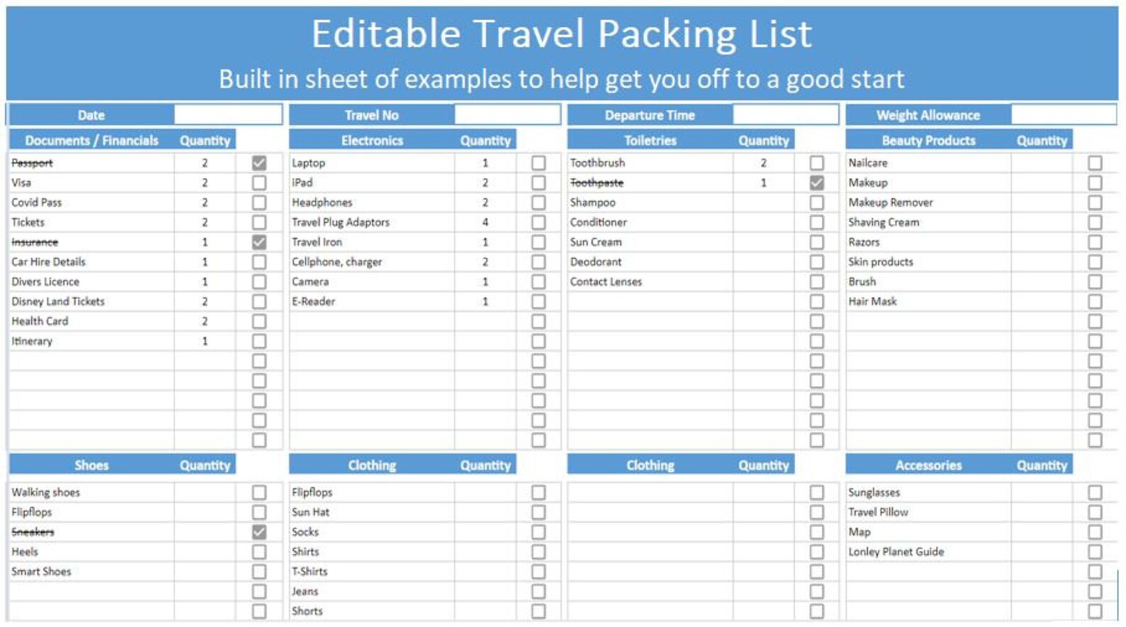 Travel Packing List Template in Excel Google Sheets Download