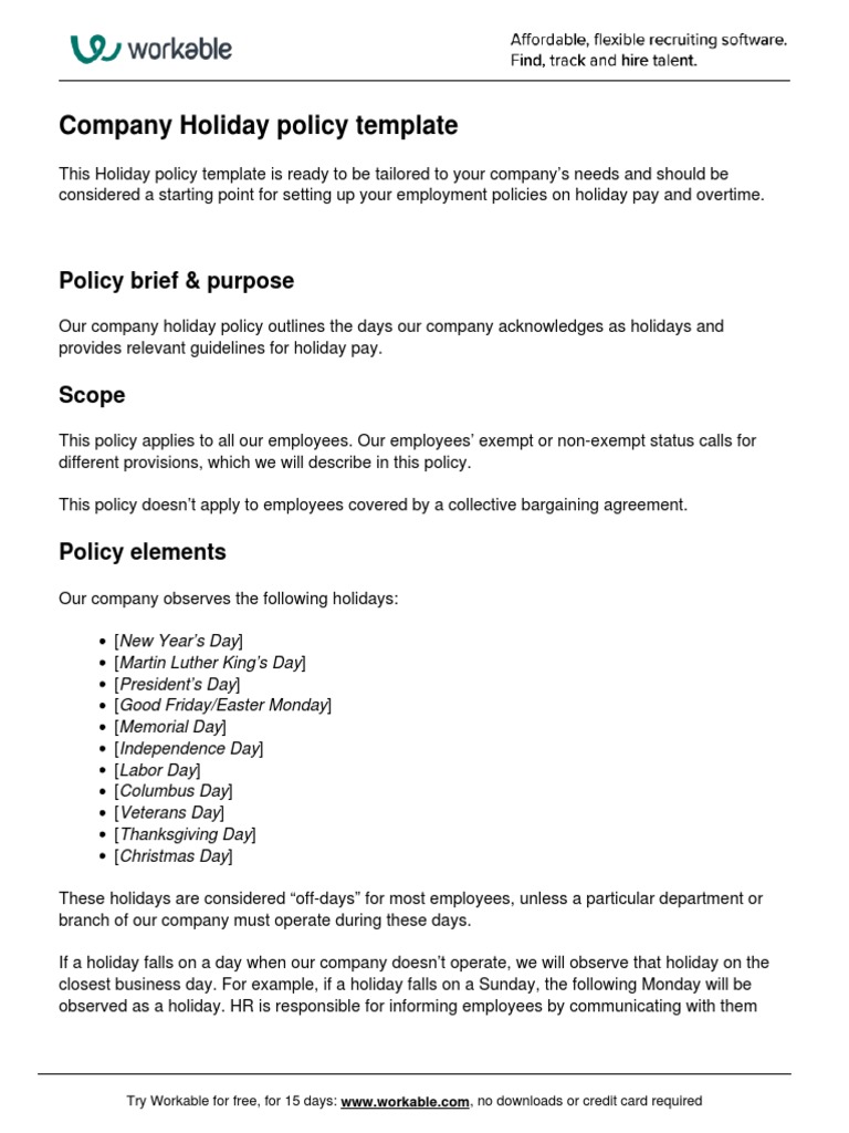 Employer Holiday Policy Template Word PDF