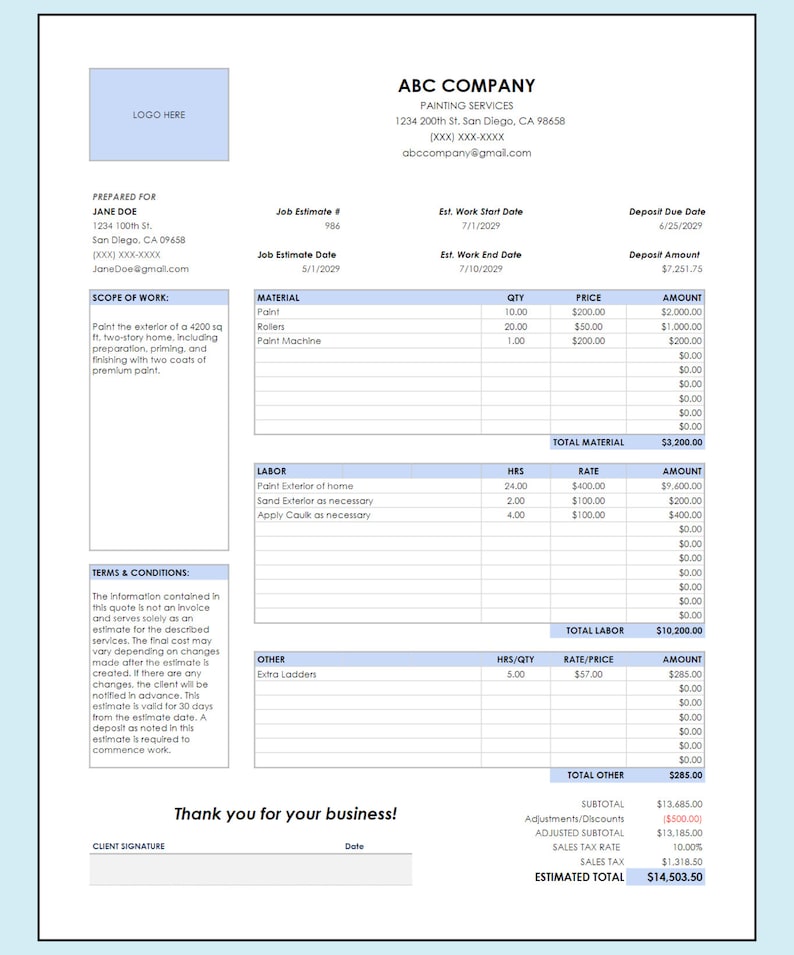 Painting Invoice Template Excel Google Sheets