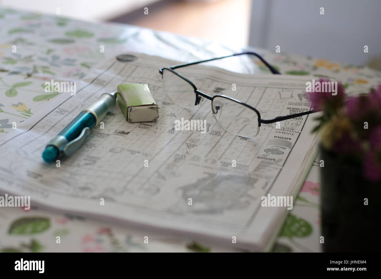 Pen and eraser on crosswordpuzzle beside a pair of glasses with light