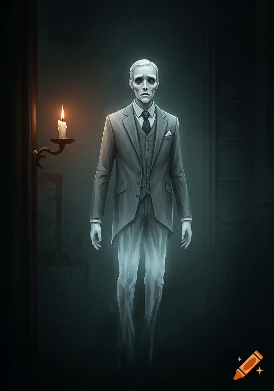 A pale ghost in a gray suit stands in a dark room with a lit candle on