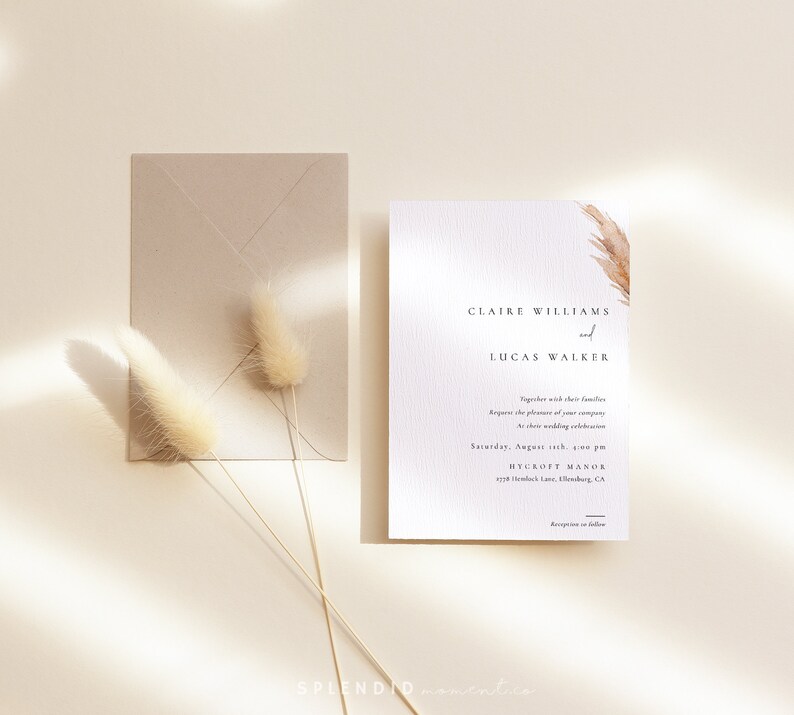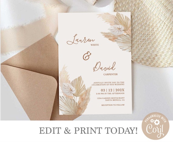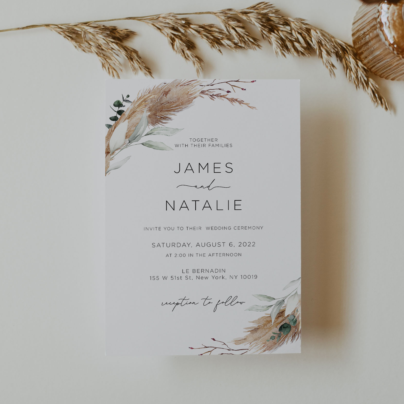 Paper Editable Pampam Grass Wedding Invitation Bohemian Wedding Invites