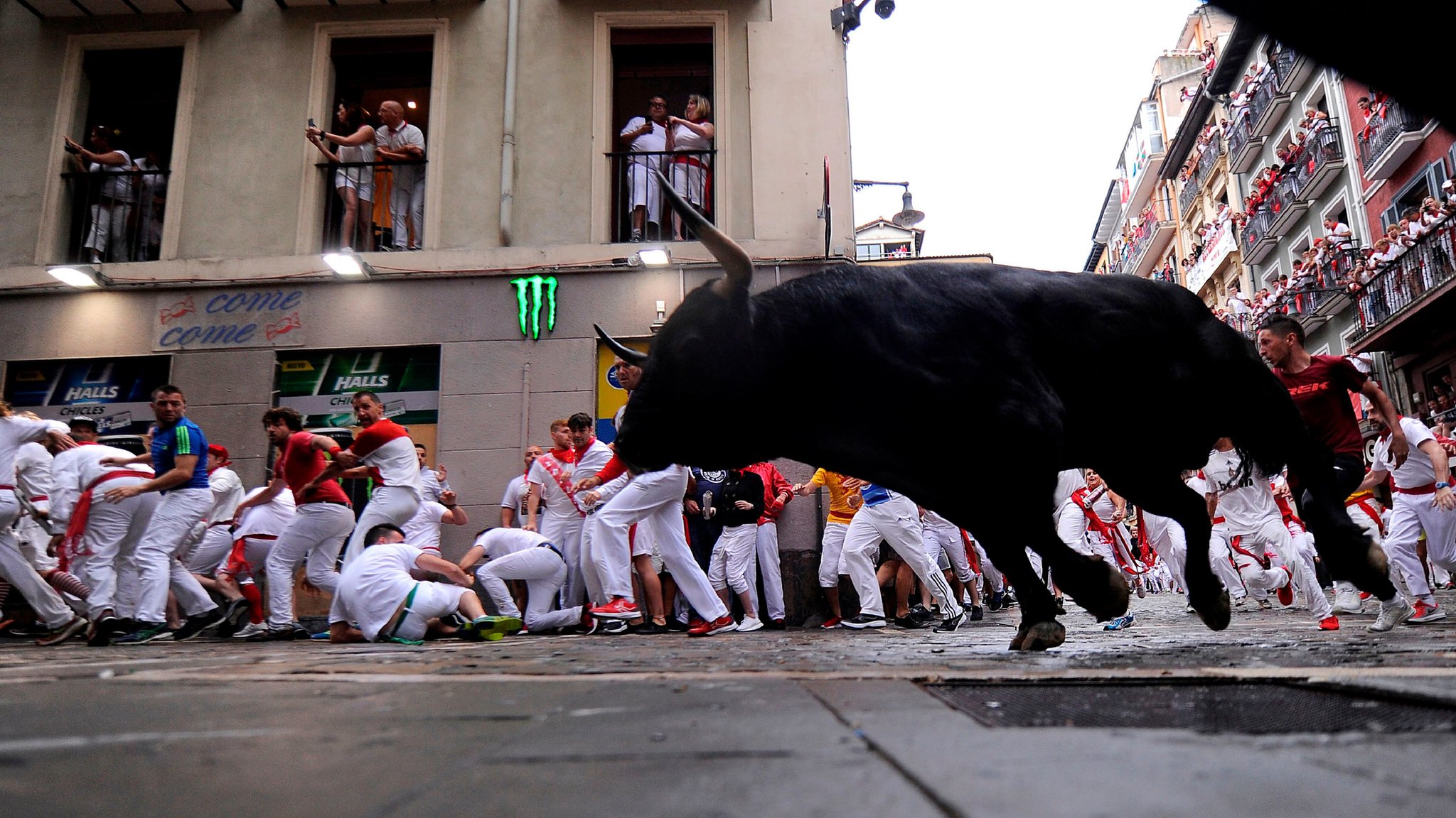Pamplona bull runners are squashed as they try to photograph animal