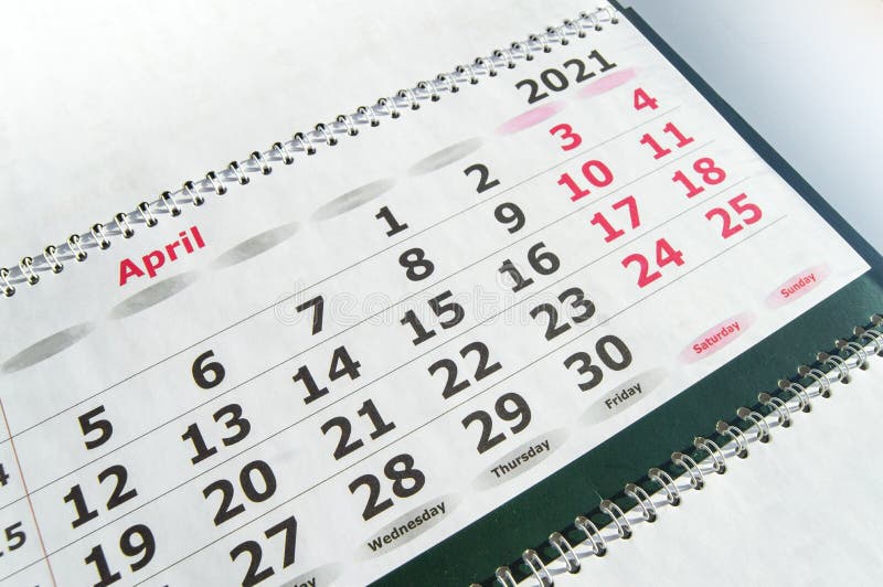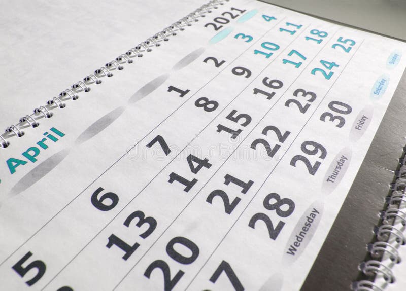 April 2021 Paper Calendar Planner with Spiral Close up Stock Image