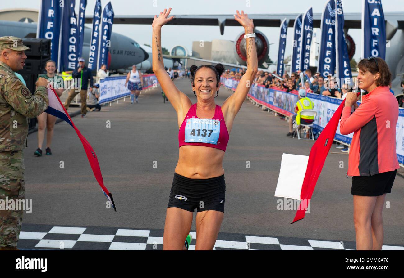 Rebecca Murray celebrates her finish of 1:18:30 as she becomes the