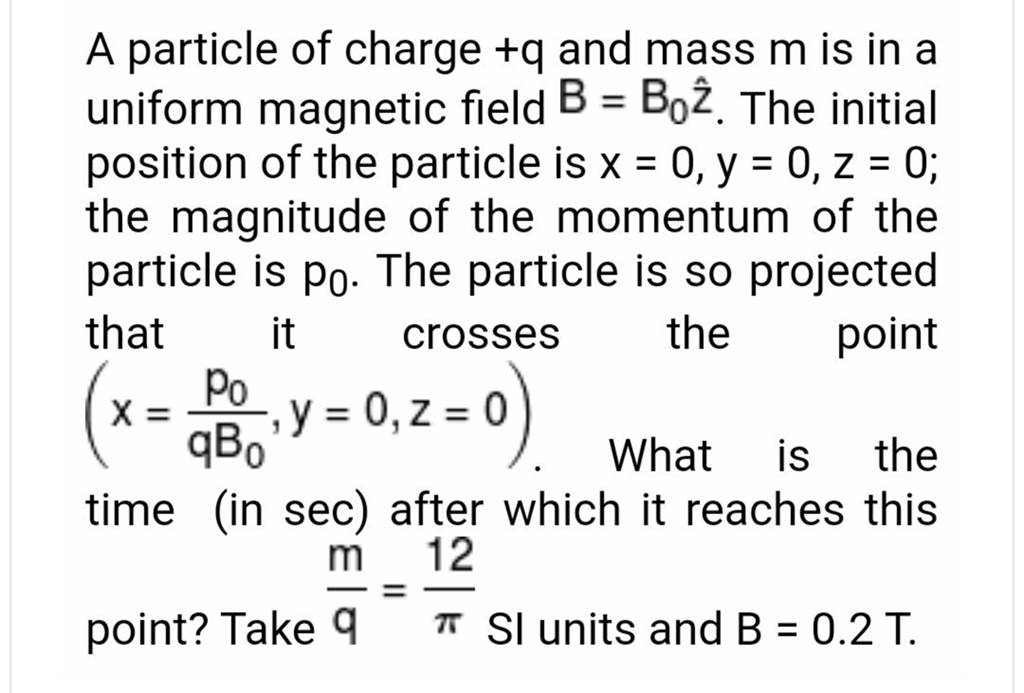 A particle of charge q and mass m is in a uniform magnetic field B=B0 z^