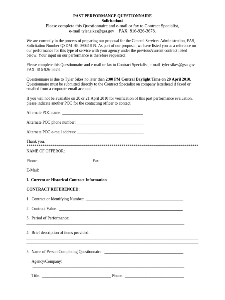 Fillable Online PAST PERFORMANCE QUESTIONNAIRE PAST PERFORMANCE Fax
