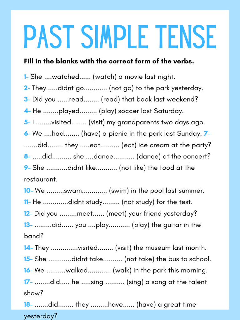 Past Simple Tense Grammar Worksheet in Blue White Basic Style PDF