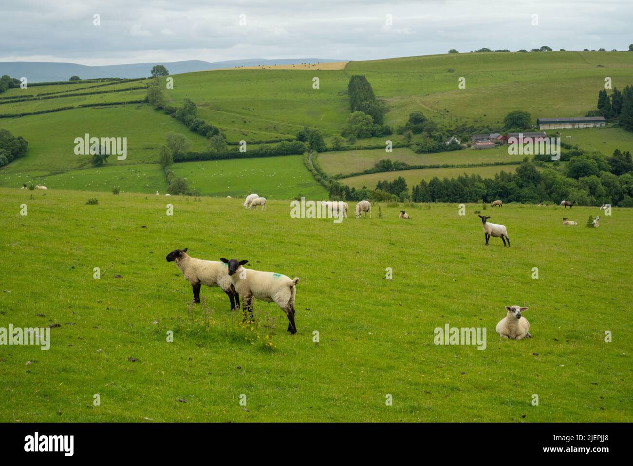 Sheep at a green pasture look at the camera in Wales Stock Photo Alamy