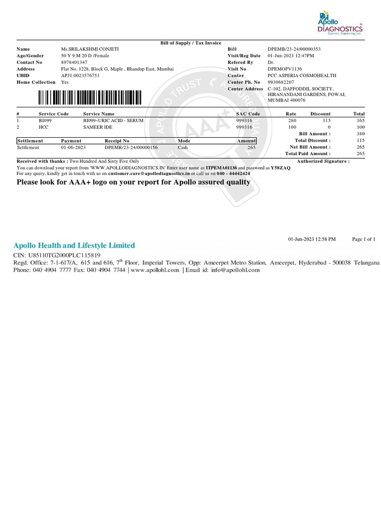 Apollo Health Check Invoice PDF