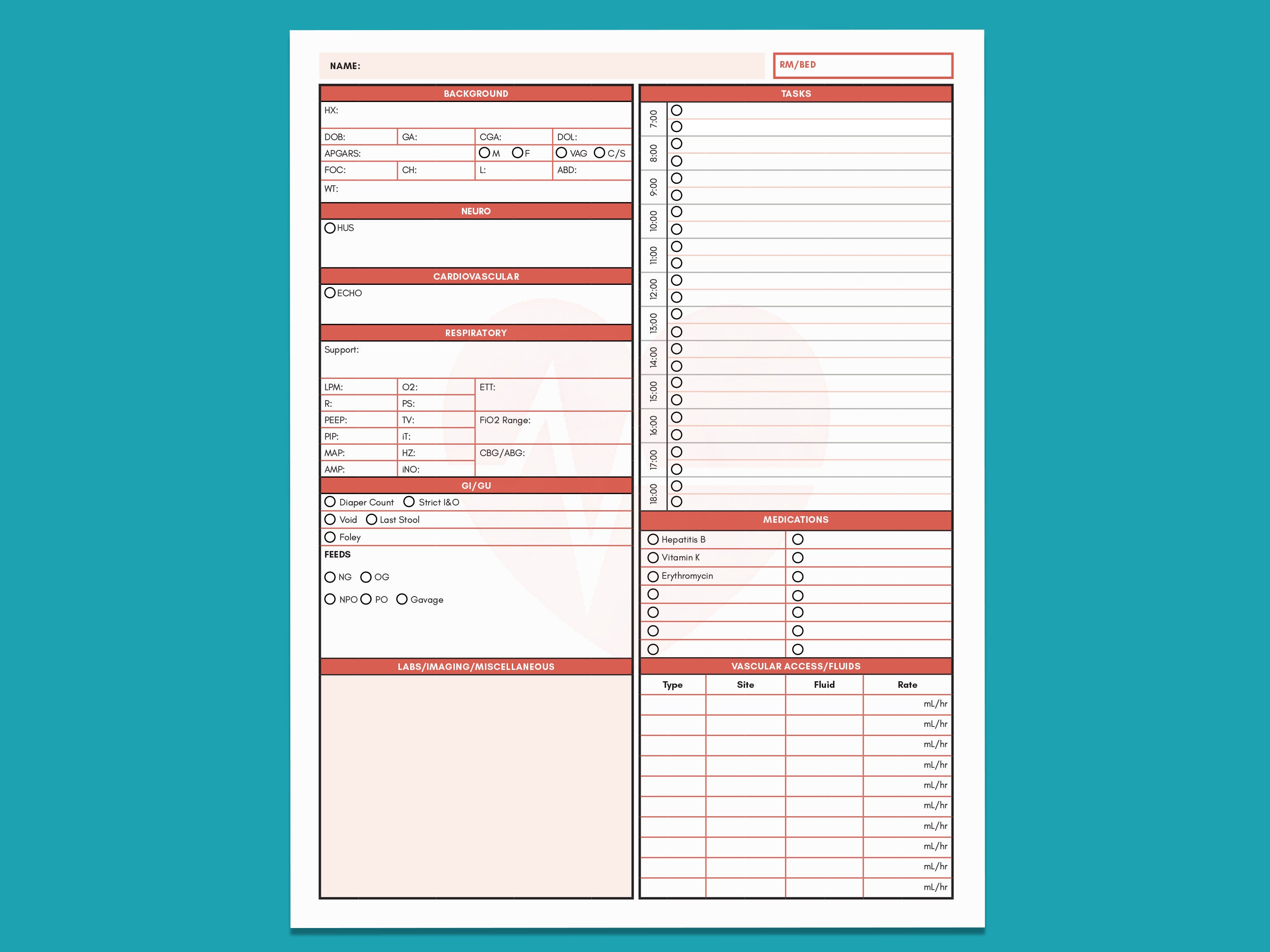 NICU Printable Nursing Report Sheet Nurse Brain Sheet One Patient