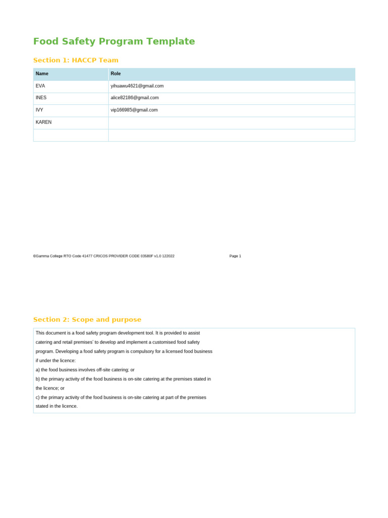 Food Safety Program Template: HACCP Team Roles Responsibilities