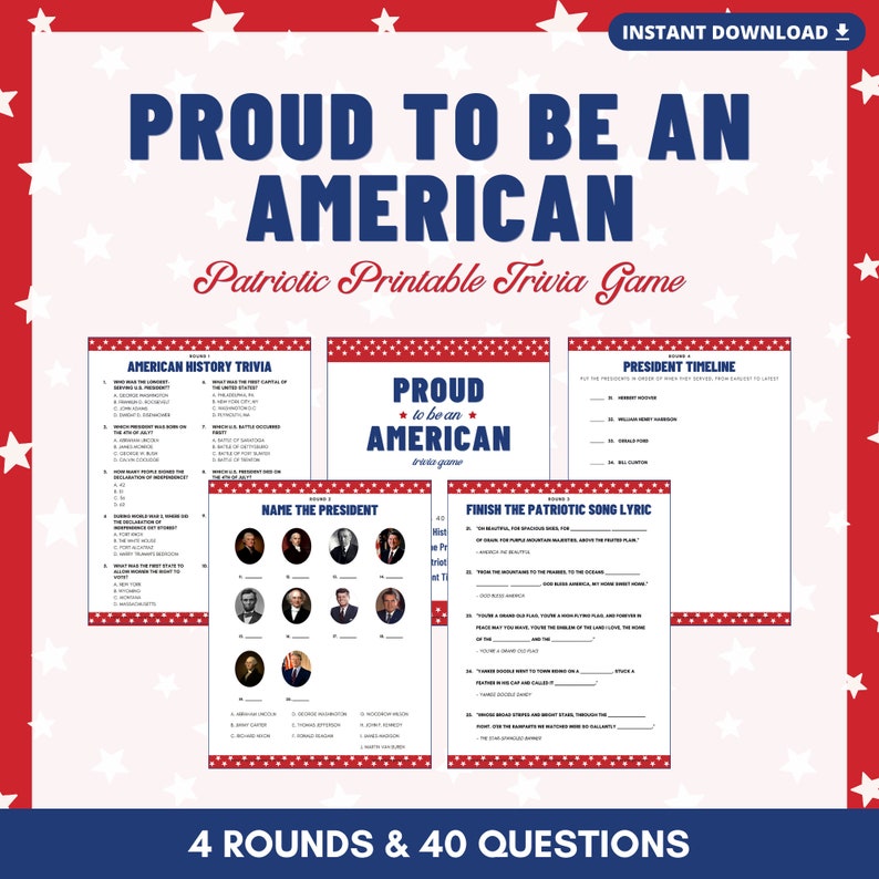 PATRIOTIC TRIVIA Printable Game 4 Rounds 40 Questions Labor Day