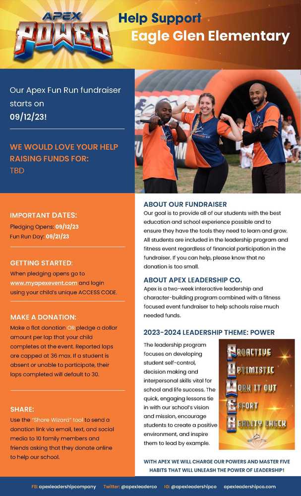 Apex Fundraiser Launching in 2 Weeks Eagle Glen Elementary School