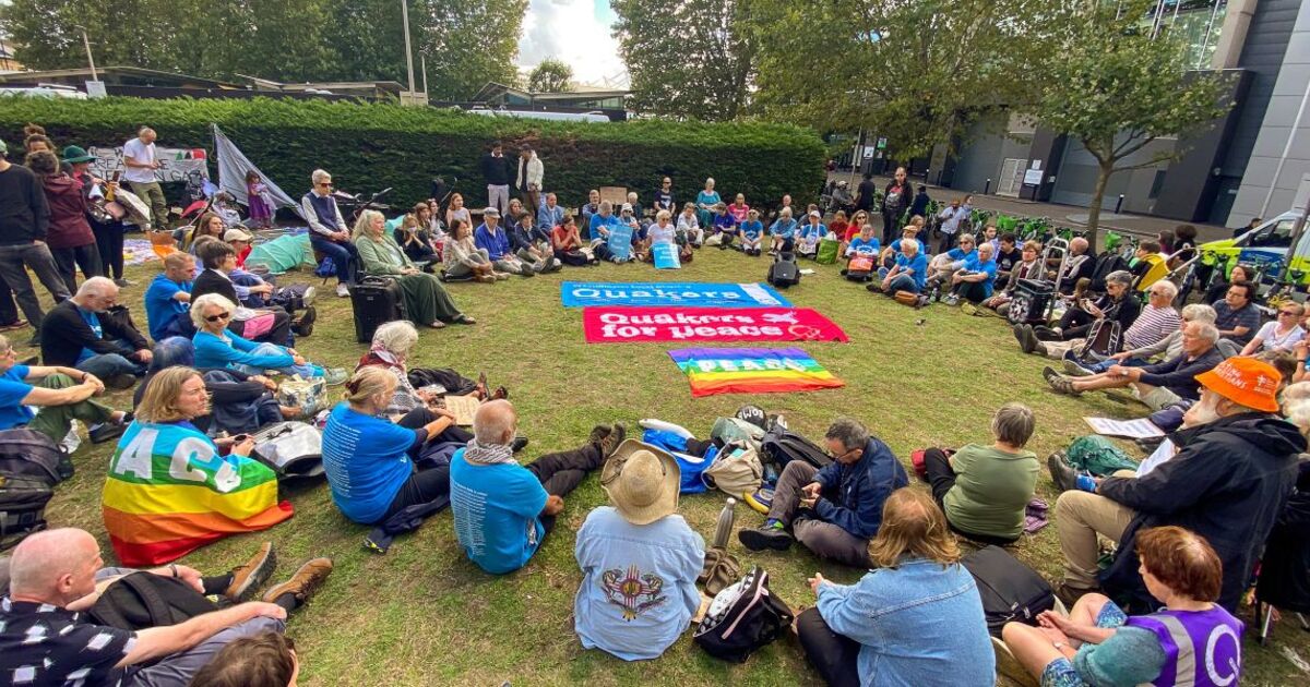 Quakers hold peaceful worship outside arms fair profiting from war and