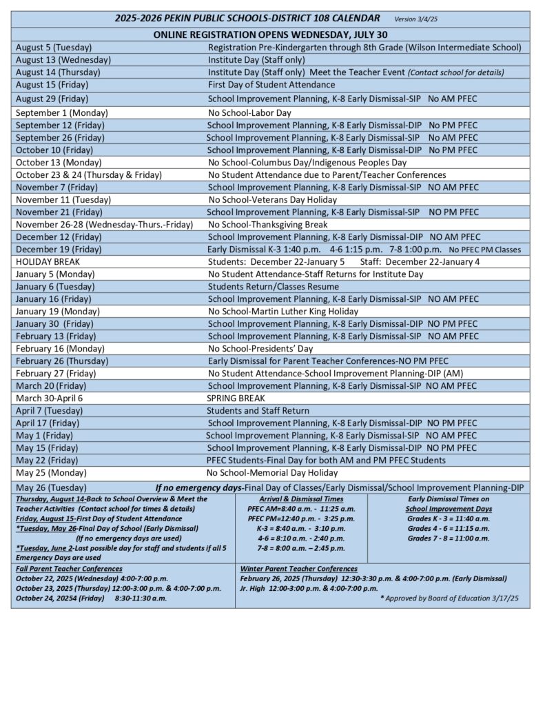 Pekin public school district 108 Calendar 2025 26 Schedule