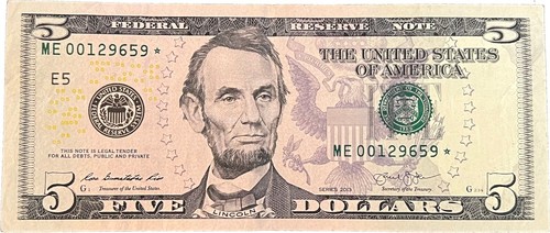 $5 Five Dollar Bill ME 00129659 * Rare Star Note 640k printed low