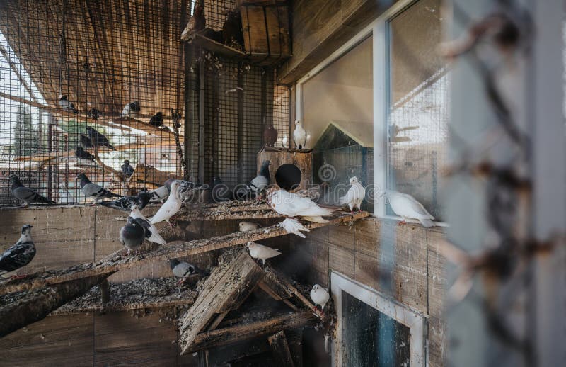 Group of Pigeons Resting on Wooden Perch Inside Aviary Stock Photo