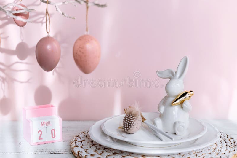 Table Place Setting with Easter Bunny Figure Eggs and Wooden Perpetual