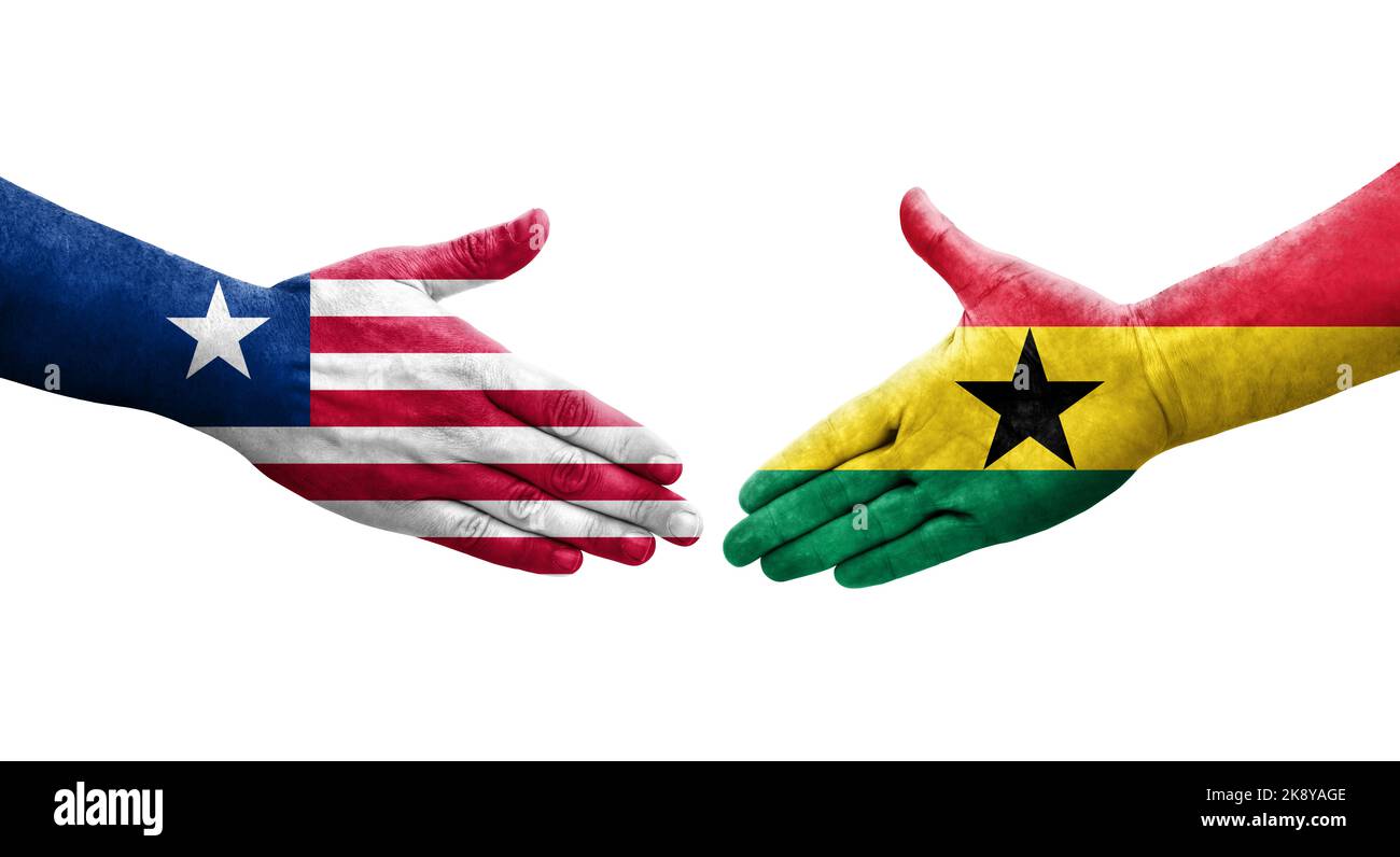Handshake between Ghana and Liberia flags painted on hands isolated
