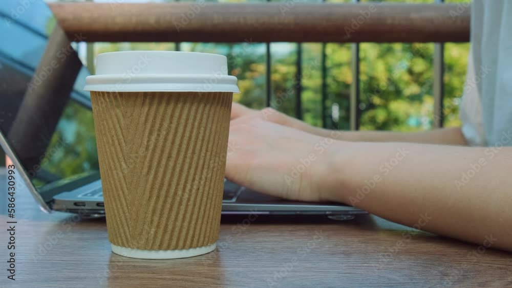 Unrecognizable Young woman works on modern laptop at wooden table in