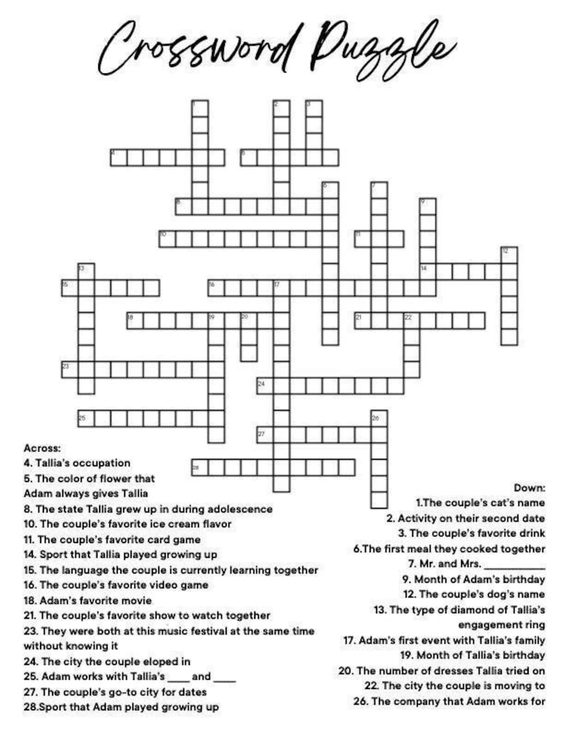 Personalized Crossword Puzzle for Wedding Bachelorette Party Bridal