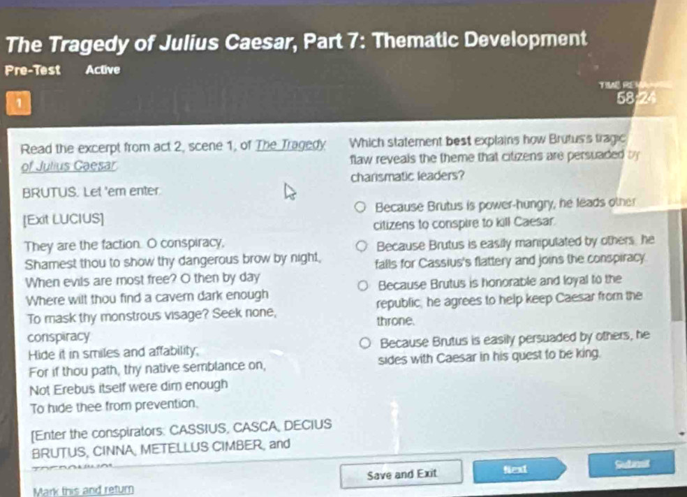 Solved: Which statement best explains how Brutus #39 s tragic flaw reveals