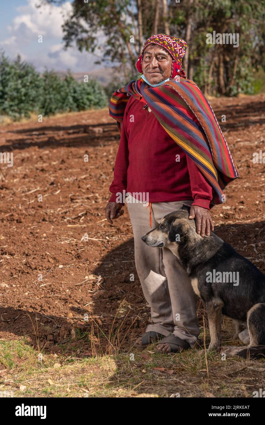 Full body of cheerful elderly Peruvian male farmer in colorful