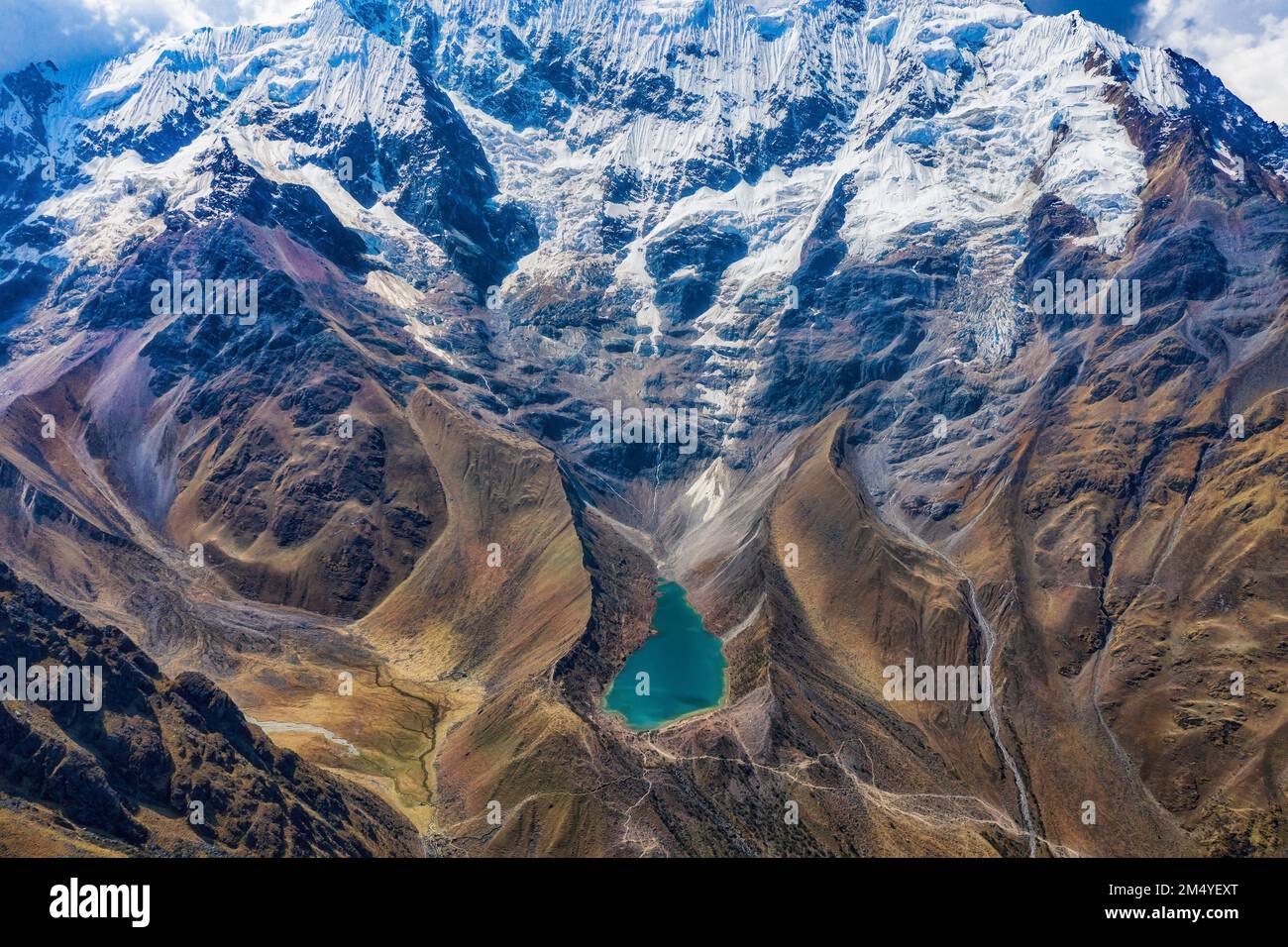 Aerial view from 500 meters of Laguna Humantay and Mount Salcantay in