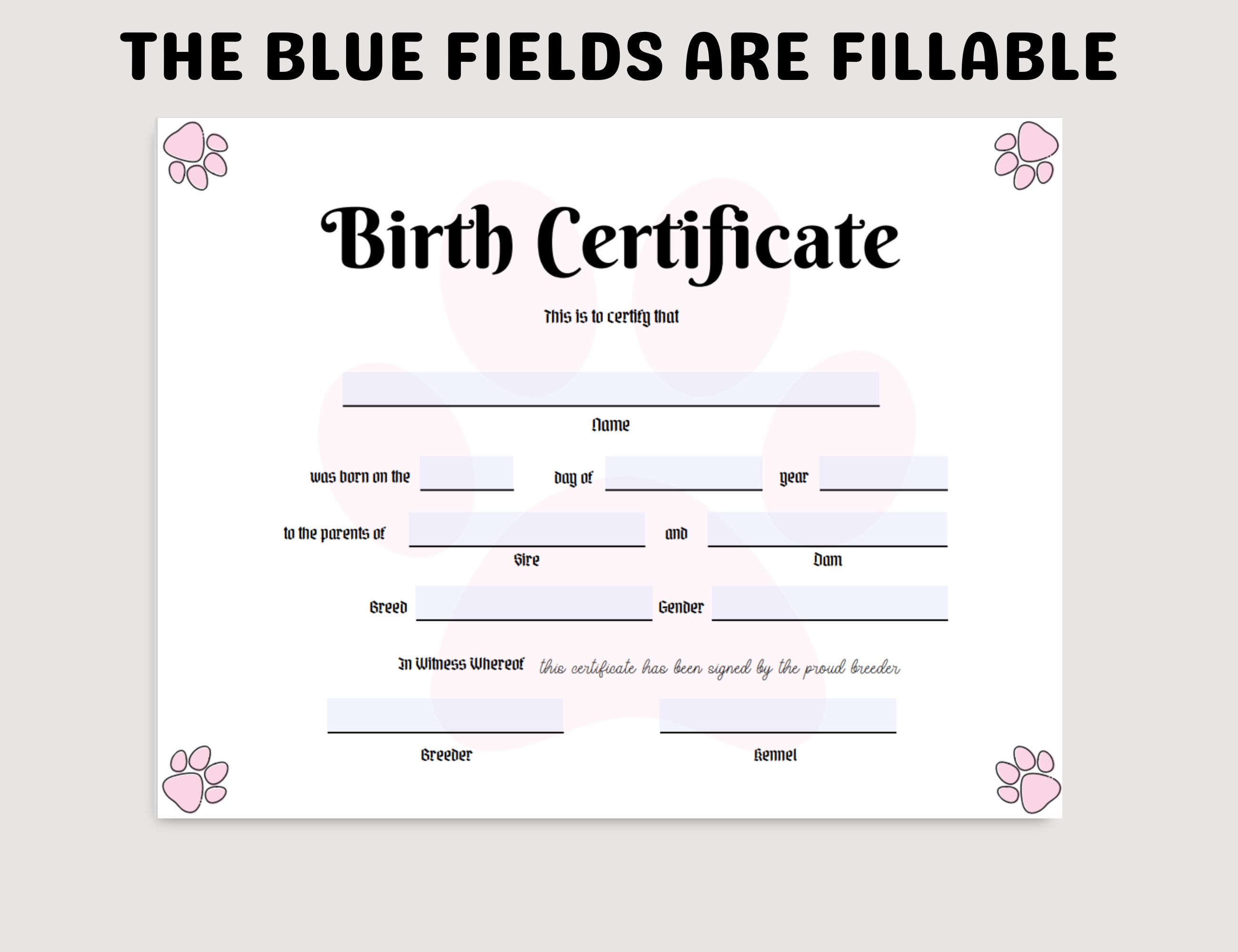 Puppy Birth Certificate Fillable PDF Dog Birth Certificate Pet Birth
