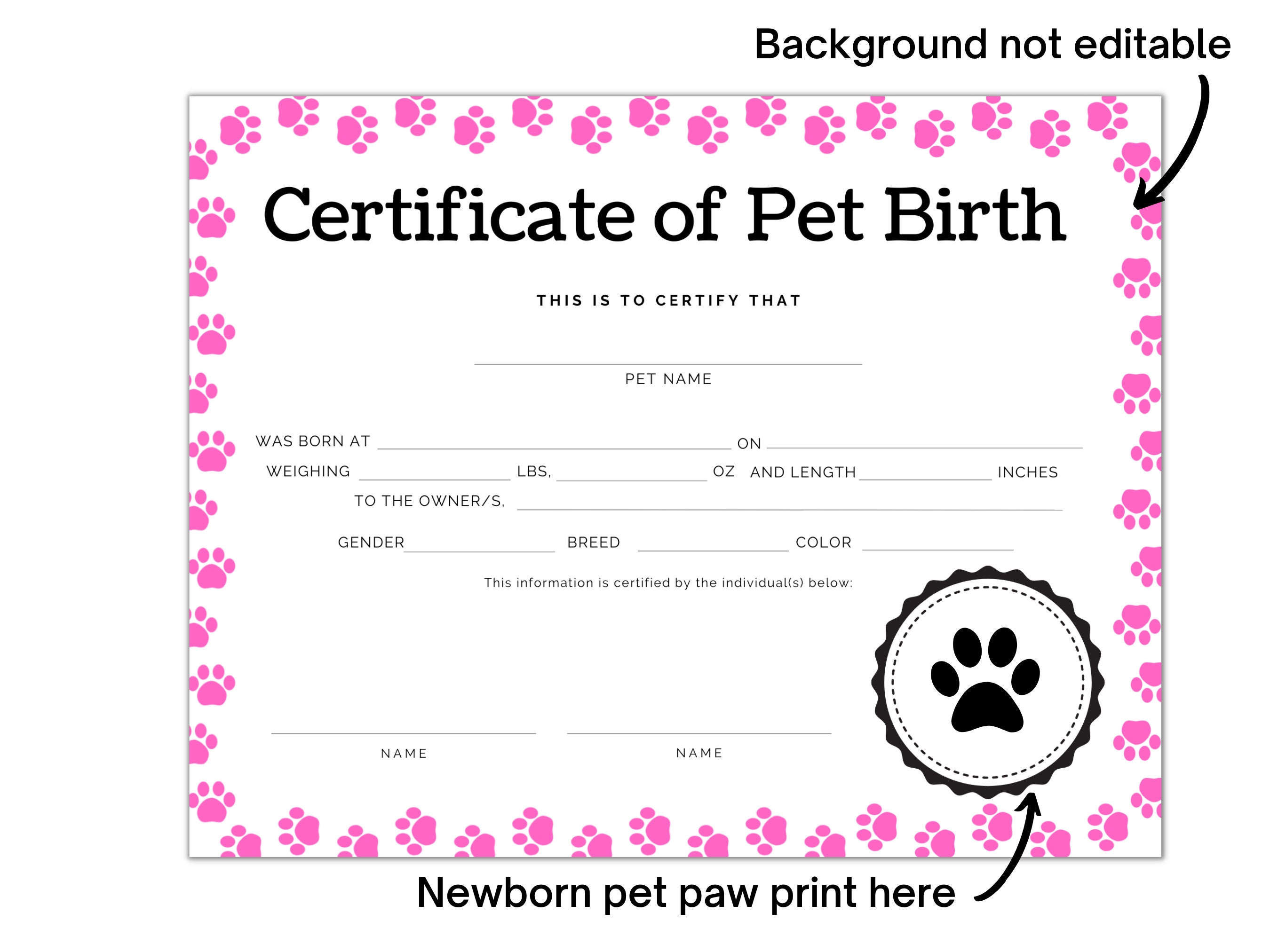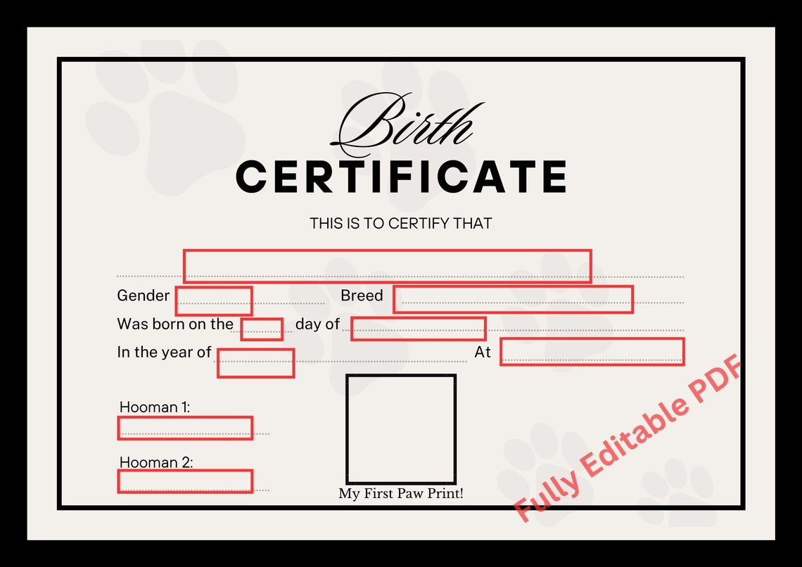 Puppy Birth Certificate Template Editable Printable Paw Certificate of