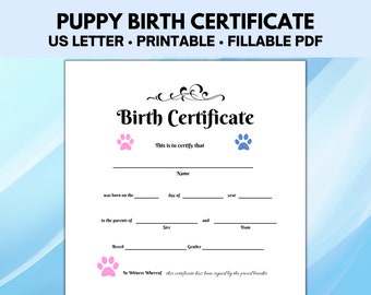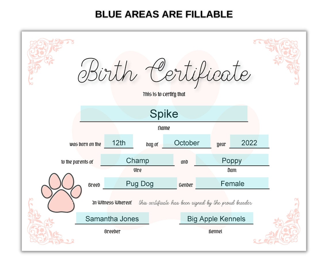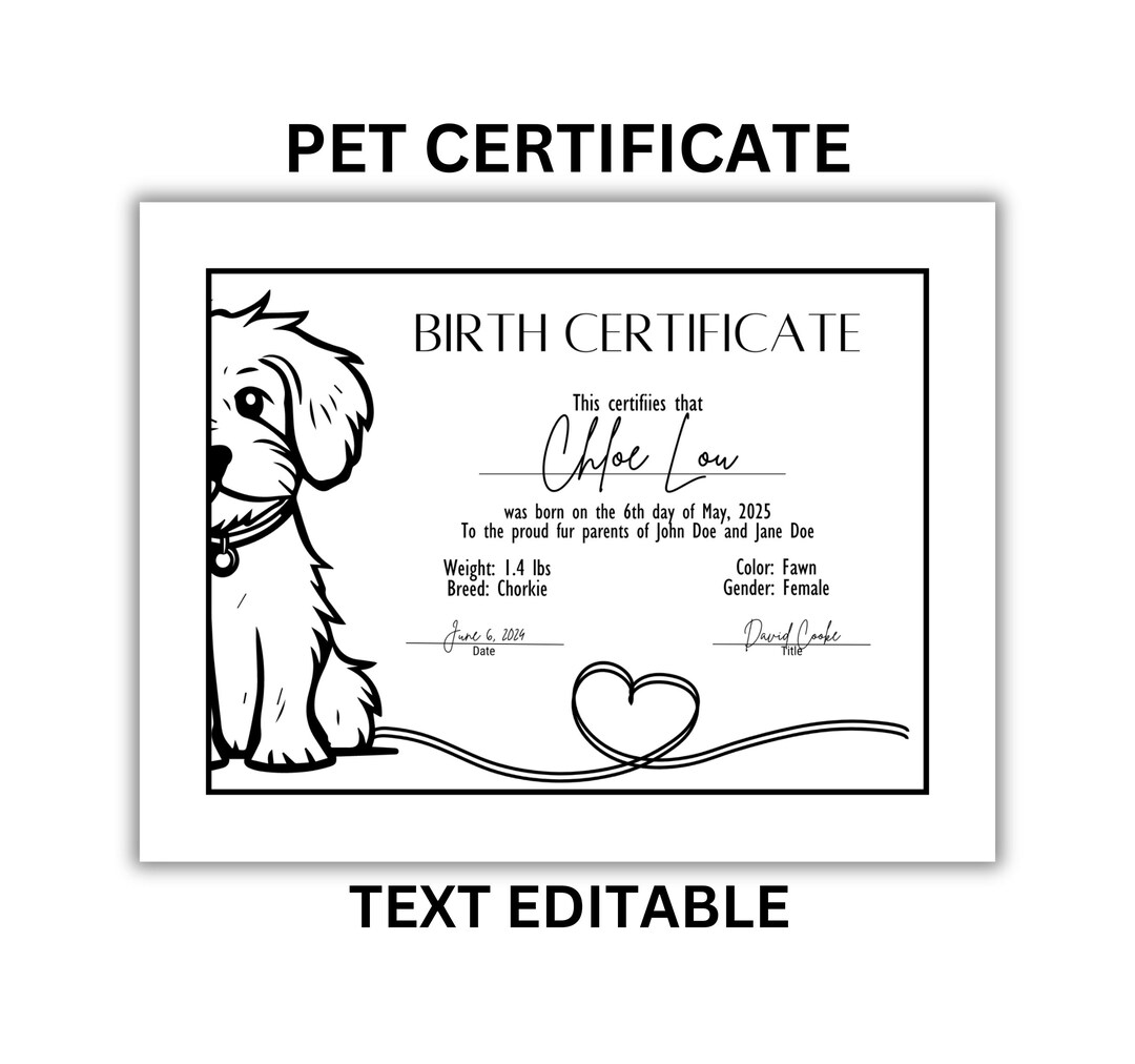 Puppy Birth Certificate Pet Birth Certificate Editable PDF Etsy