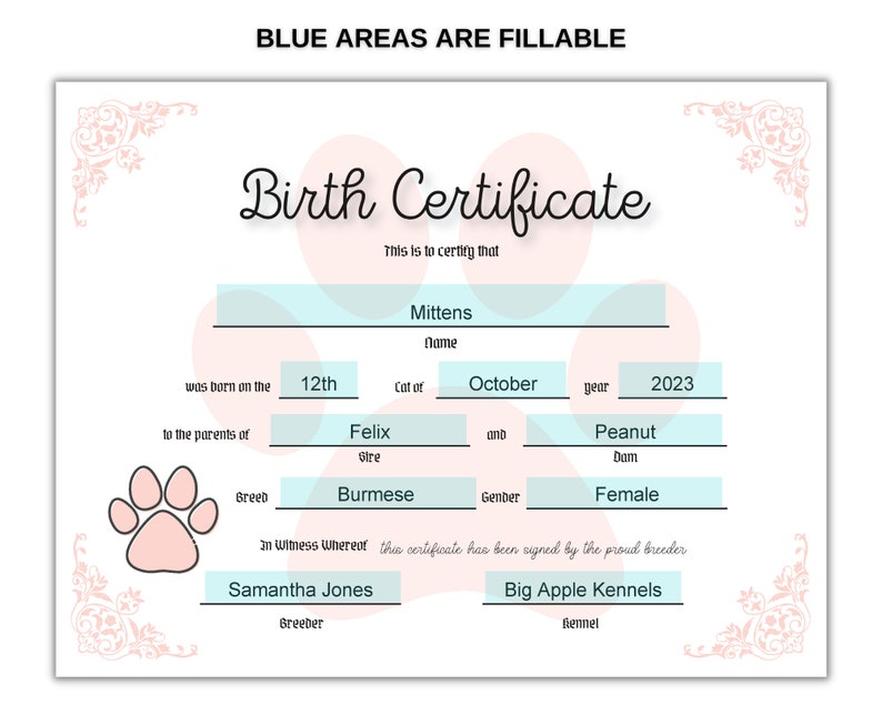 Kitty Birth Certificate Pet Birth Certificate Editable PDF Etsy