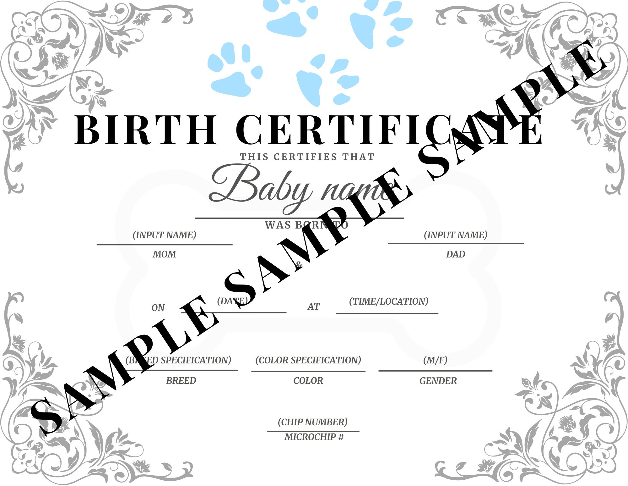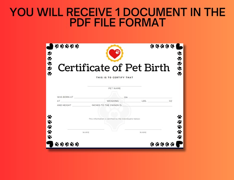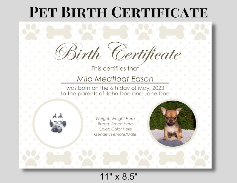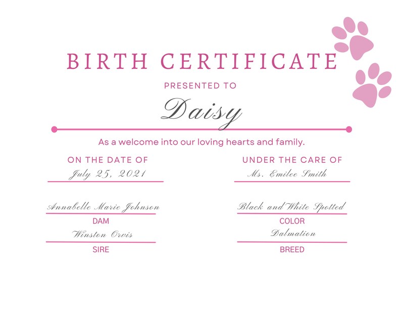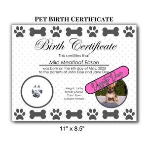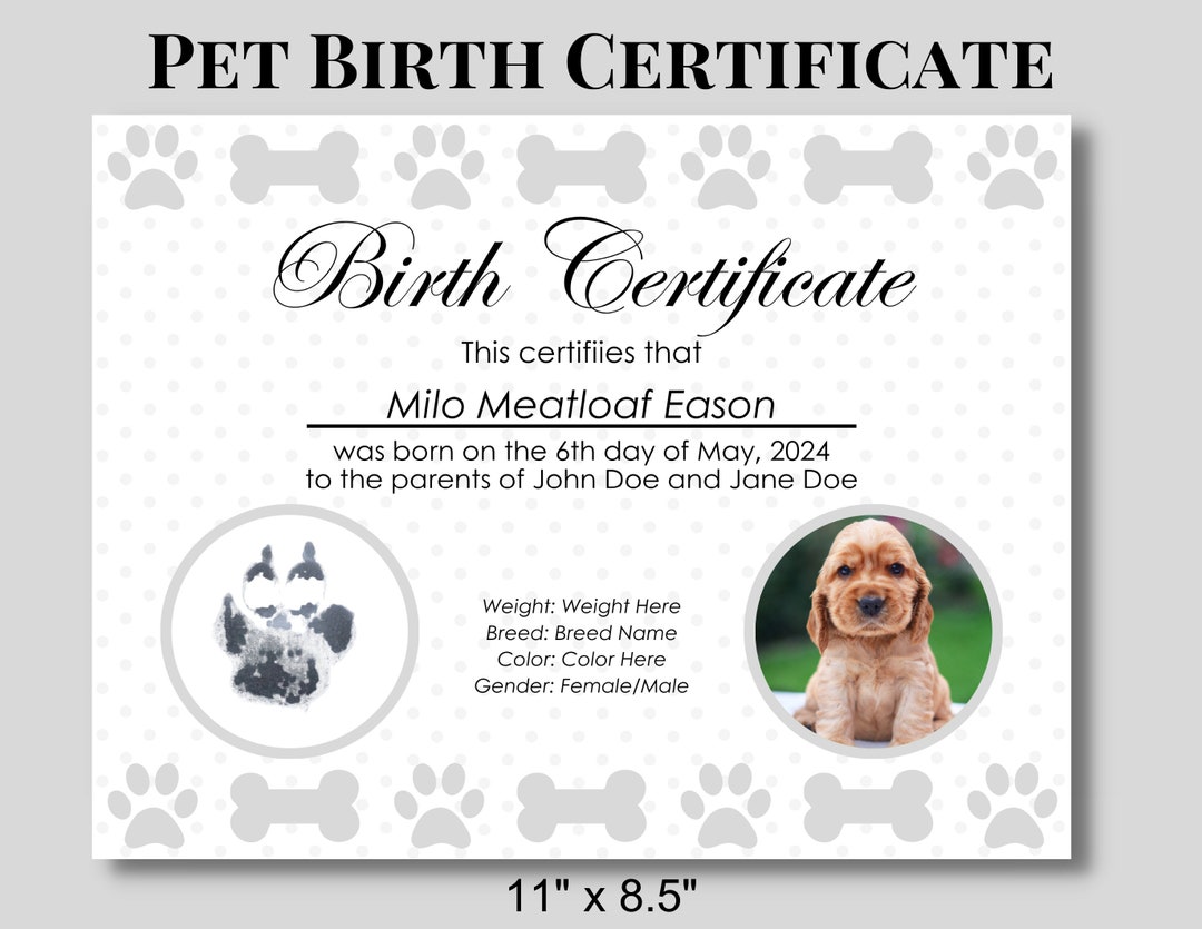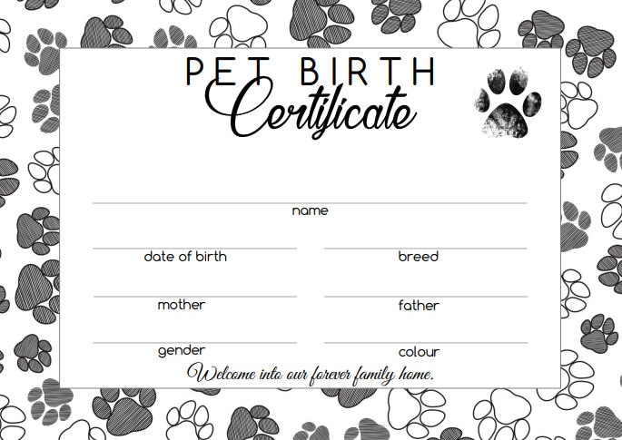 Pet / Puppy / Kitten Pet Birth Certificate Paws instant Downloads Etsy