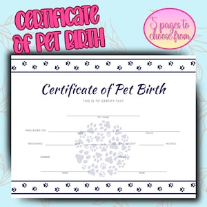 PRINTABLE Pet Birth Certificate 5 Certificates for Dog #39 s/cat #39 s Record