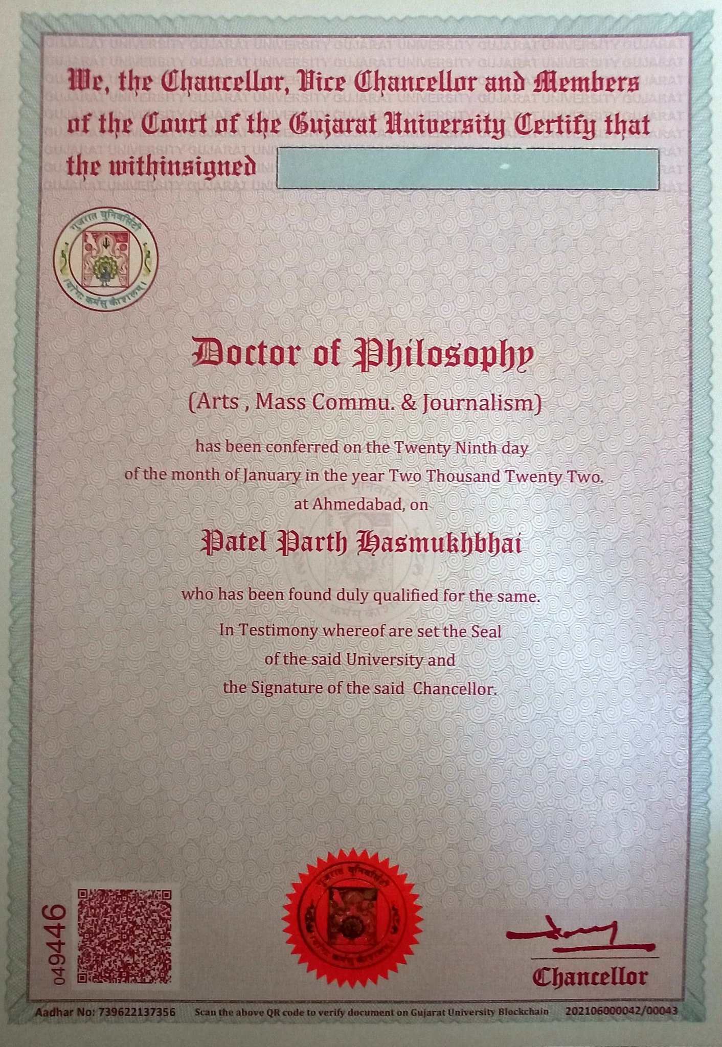 PhD Degree Certificate