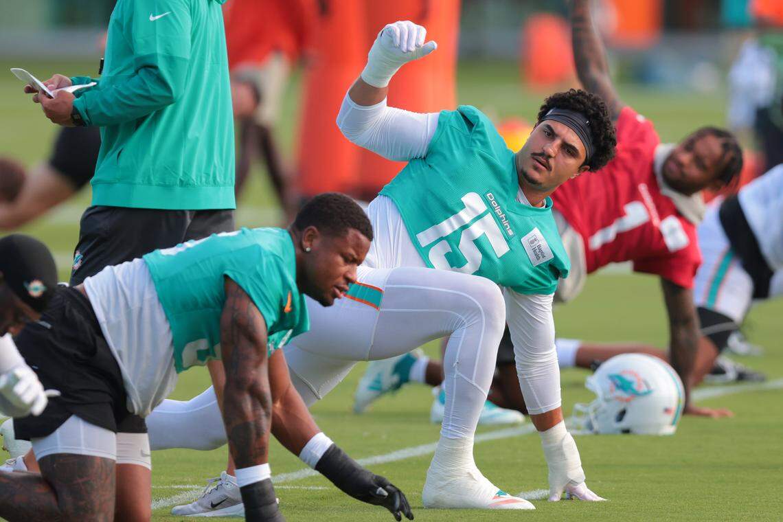 Dolphins #39 Jaelan Phillips leaves practice with apparent knee injury
