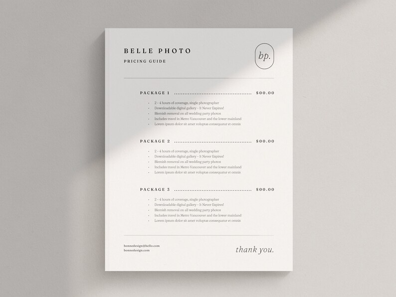 Photography Pricing Template for Canva One Page Pricing Guide for