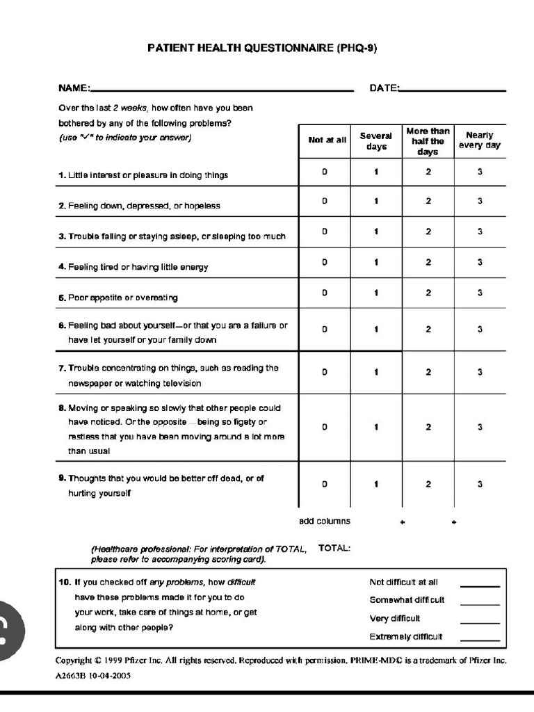 Patient Health Questionnaire (Phq 9) Pfizer Inc Fill Out Sign