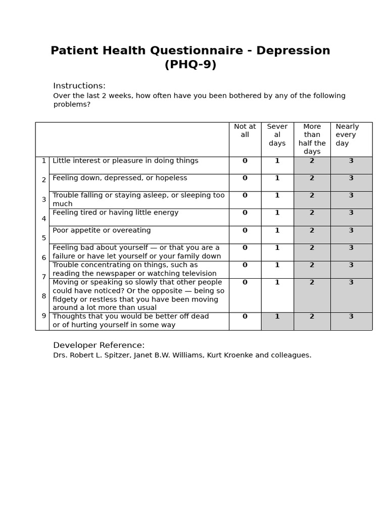 Patient Health Questionnaire (PHQ 9) Example Free PDF Download