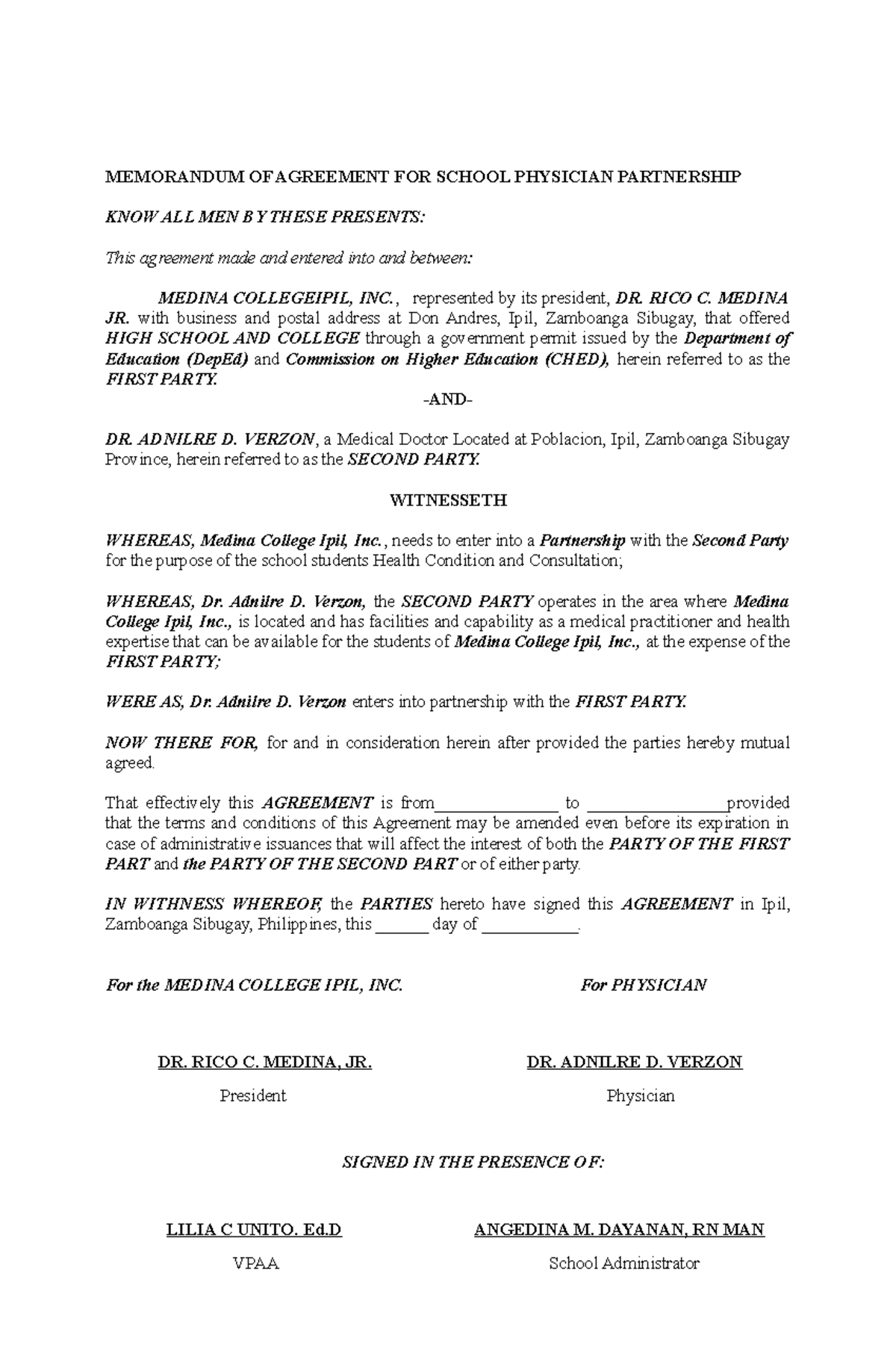Memorandum OF Agreement FOR School Physician Partnership MEMORANDUM