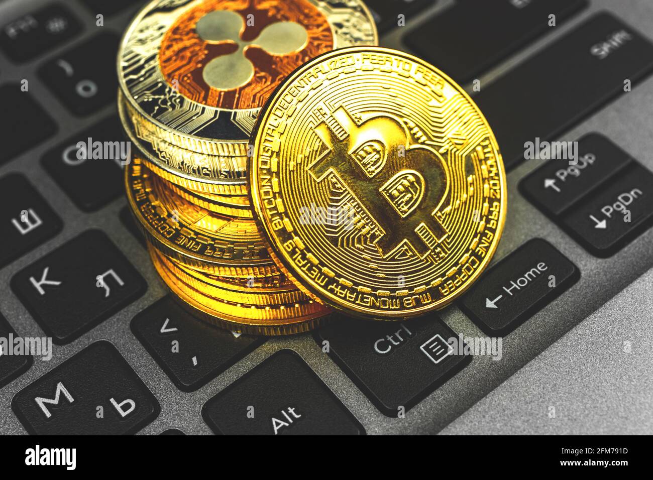 Golden bitcoin with other crypto currency coins on laptop keyboard