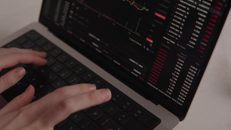 Hands typing on laptop keyboard with cryptocurrency trading platform