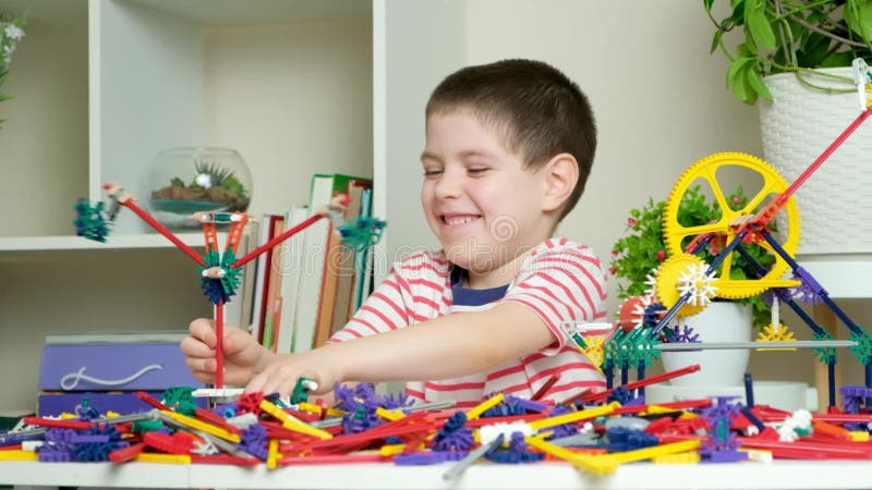 A Little Boy Plays with a Constructor Creating Figures from Gears and