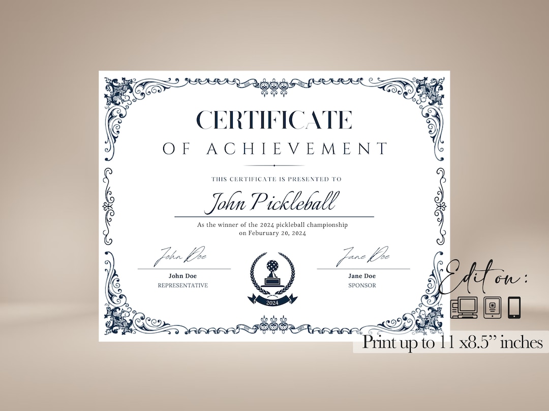 Pickleball Printable Award Certification Editable Template Letter size