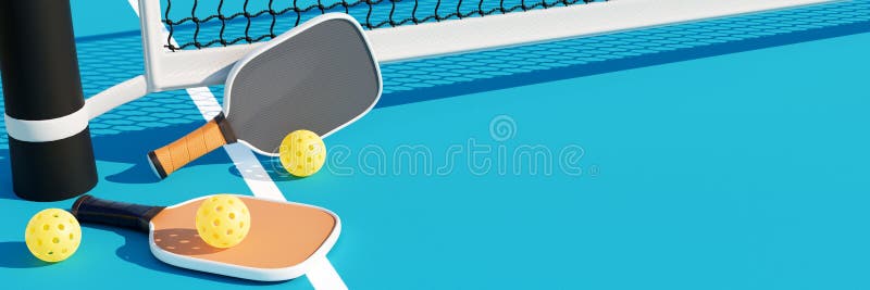 Two Pickleball Rackets and Balls Lie on the Net Posts on the Court