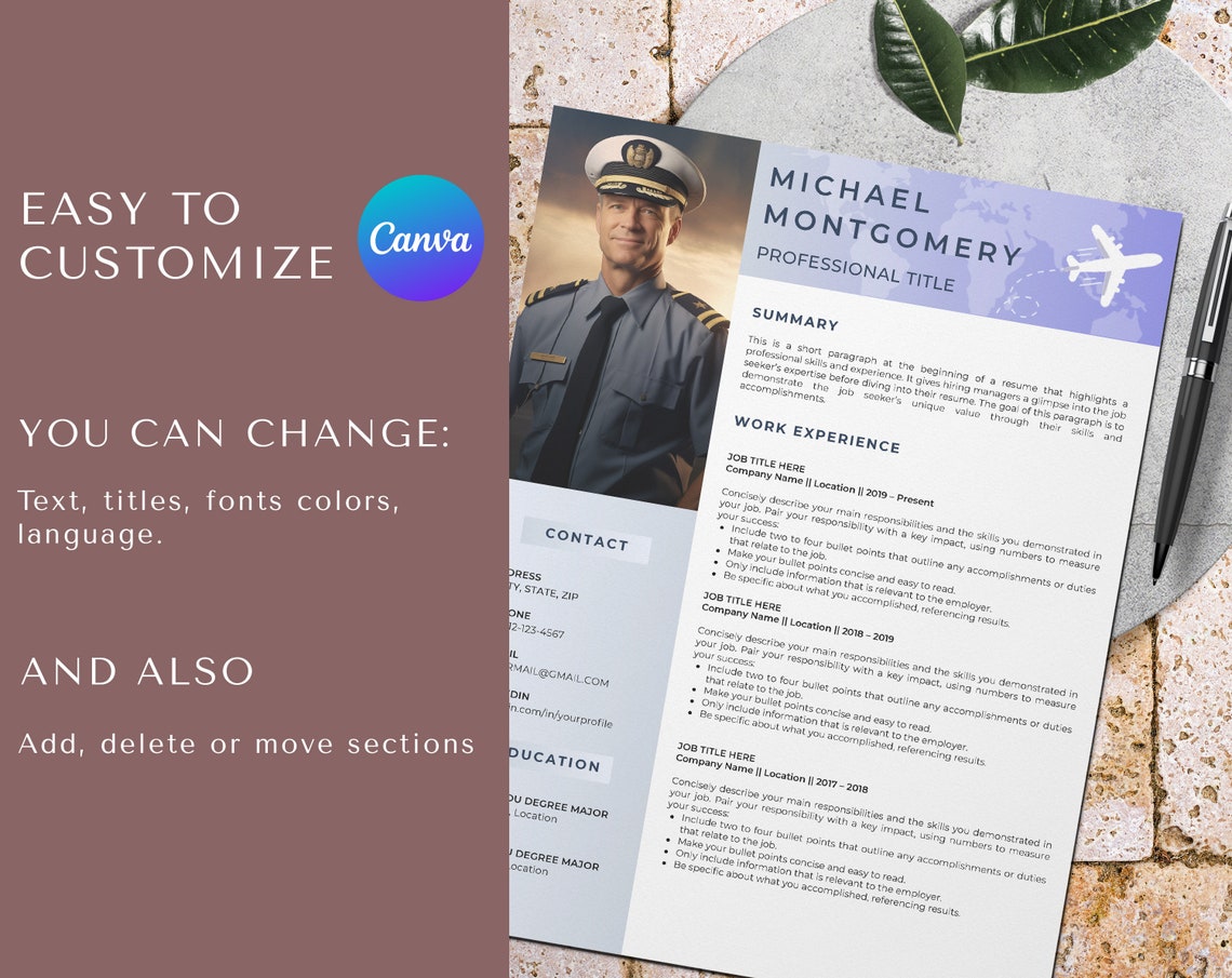 Pilot Resume Template With Photo for Canva Airline Pilot Resume