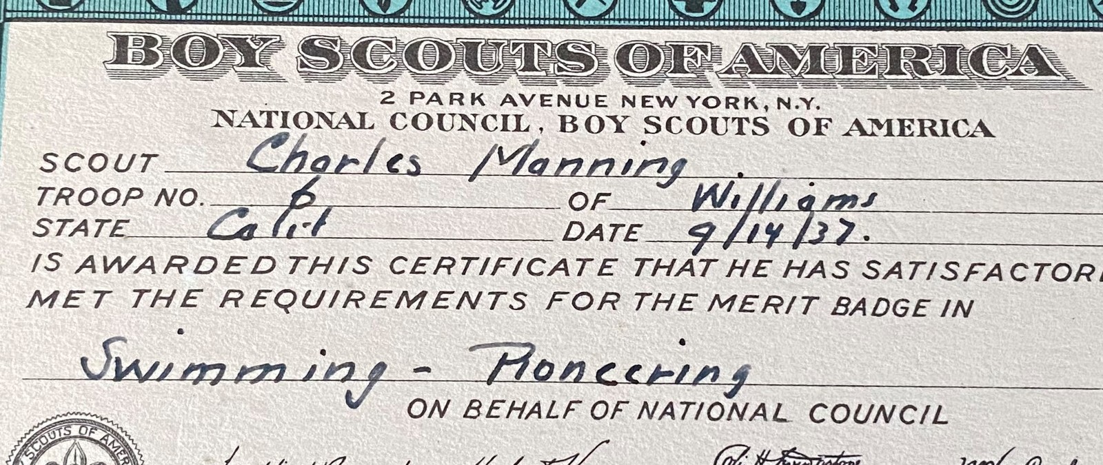 1937 Boy Scout Swimming Pioneering Merit Badge Card Other