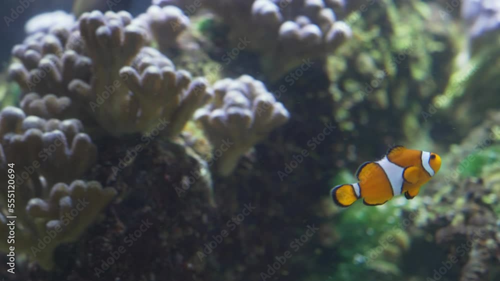 Lonely clownfish (Amphiprion ocellaris) lost in the sea swimming away